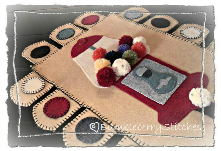I had several ideas but I really liked the idea of making a vintage gumball machine. To me little pom poms just remind me of gumballs. So I sat down and drew it out. I decided after drawing it that I would make it a penny rug. I have been wanting to make one for a long time. Instead of wool I made mine with a rayon/felt blend. It’s a lot less expensive than wool.