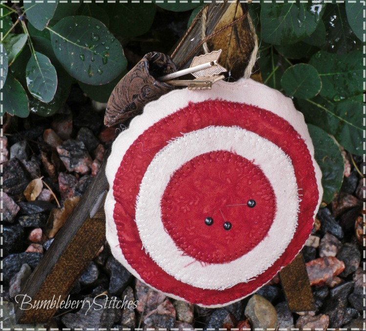 I made the target with four sizes of circles that I appliqued on top of each other with the blanket stitch. I wanted to edges to look worn so I didn’t worry about accuracy with my stitches or bias edges.