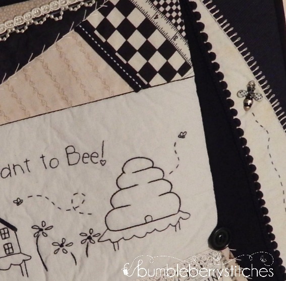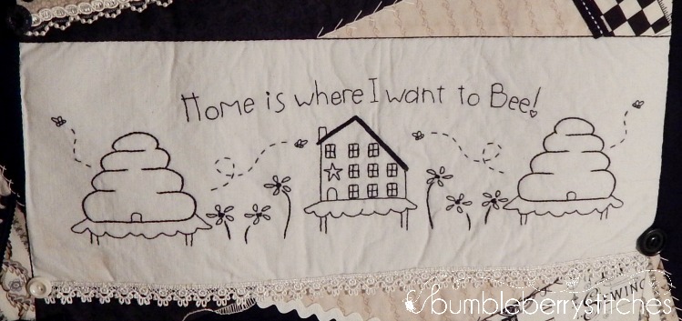 What a great say to use the symbol of the bumblebee — at home and working hard. Love the crazy quilt frame on your stitching!