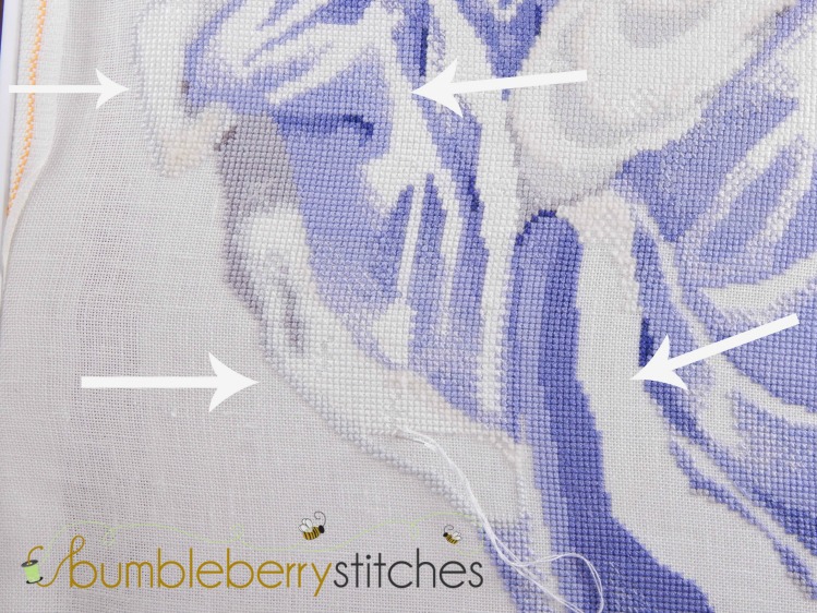 I continued working Saturday and was able to start filing in the areas with white (DMC Blanc).