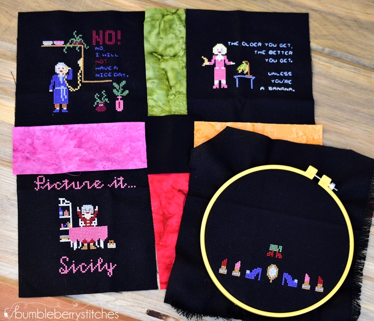 What a wonderful project! Love the one with “picture it….Sicily”. I can just hear her saying that. The colors really pop on your black fabric, too. Love it!